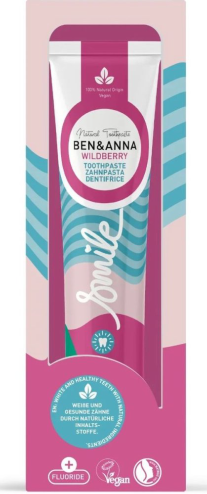 Ben & Anna Wildberry Toothpaste is een 100% natuurlijke tandpasta met natriumfluoride en ananas-extract voor een zachte reiniging en de oplossing van tandplak. Deze vegan tandpasta is vrij van parabenen, ftalaten en microplastics en het ondersteunt oceaanreiniging. Het