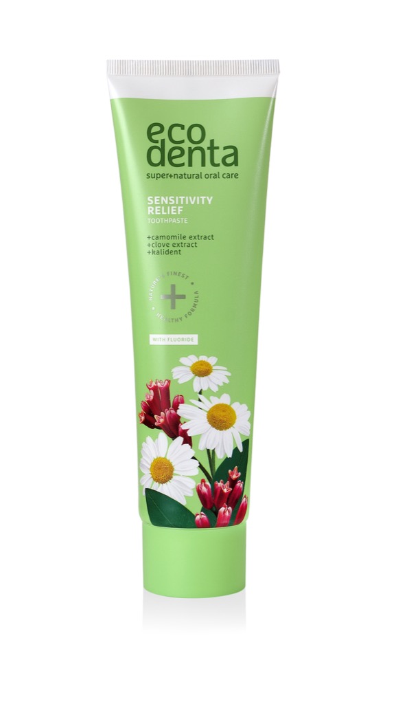 Ecodenta Tandpasta Sensitivity Relief is een tandpasta voor de gevoelige tanden met kamille, kruidnagel extracten en Kalident speciaal ontworpen voor mensen die last hebben van gevoelige tanden. Deze tandpasta heeft een tweedelig effect op gevoelige tanden: extracten van