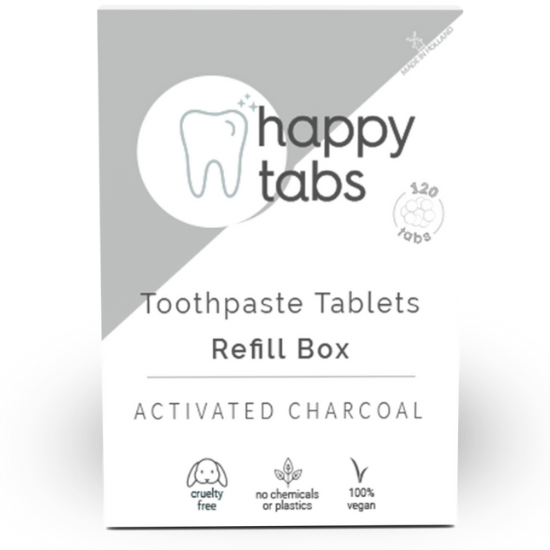 Happy Tabs Tandpasta Mint Charcoal – zonder Fluoride, 120 stuks, combineert de natuurlijke, tandenblekende voordelen van actieve houtskool met de verfrissende smaak van munt. Geniet van een stralende glimlach, met de bijkomende voordelen van milieuvriendelijke verpakking.