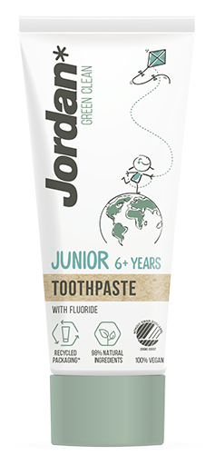 Jordan Green Clean Junior Tandpasta voor kinderen vanaf 6 jaar met milde fruitige smaak, en fluoride en xylitol dat optimaal bescherming biedt tegen gaatjes. Ook bevat de tandpasta chamomilla-extract vanwege de kalmerende en desinfecterende eigenschappen en is gezoet met