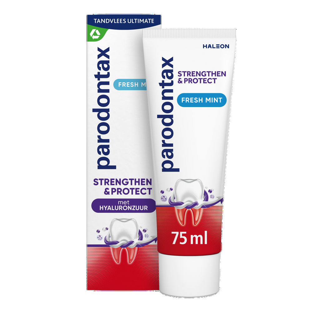 Parodontax Strengthen & Protect Fresh Mint Tandpasta (75ml) met hyaluronzuur en is er speciaal voor de gevoelige tanden en tandvlees. Het is een verfrissende tandpasta die bijdraagt aan een goede mondverzorging en helpt het tandvlees gezond en sterk te houden. De tandpasta