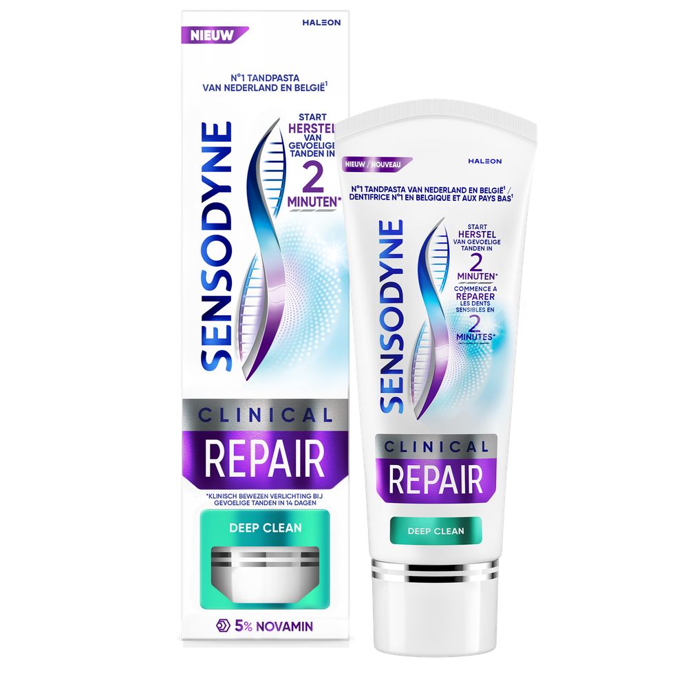 Sensodyne Clinical Repair Deep Clean Tandpasta met 5% novamin start het herstel van gevoelige tanden in slechts 2 minuten¹ . De formule vormt een beschermende laag over de gevoelige delen van je tanden, wat helpt tegen gevoeligheid². Deze dagelijkse fluoride tandpasta