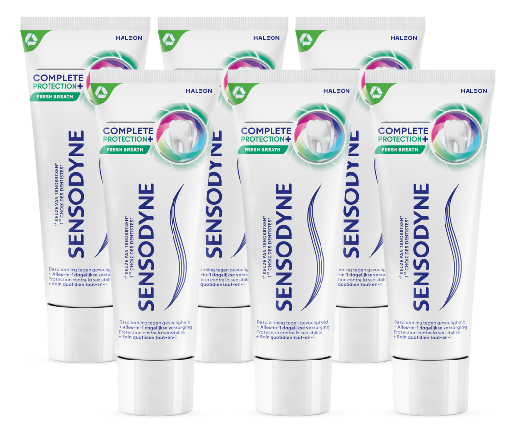 Sensodyne Complete Protection + Fresh Breath Tandpasta biedt meerdere mondverzorgingsvoordelen samen met klinisch bewezen bescherming tegen gevoeligheid. Fresh Breath zorgt voor een blijvend fris gevoel. Deze tandpasta bevat natuurlijke pepermunt en zoete groene munt met een