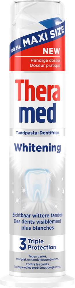 Theramed Whitening 3 Triple Protection Tandpasta (100ml) biedt een effectieve drievoudige bescherming voor een stralend wit gebit. Deze innovatieve tandpasta combineert krachtige whitening-ingrediënten met uitstekende bescherming tegen gaatjes en tandplak. De unieke formule